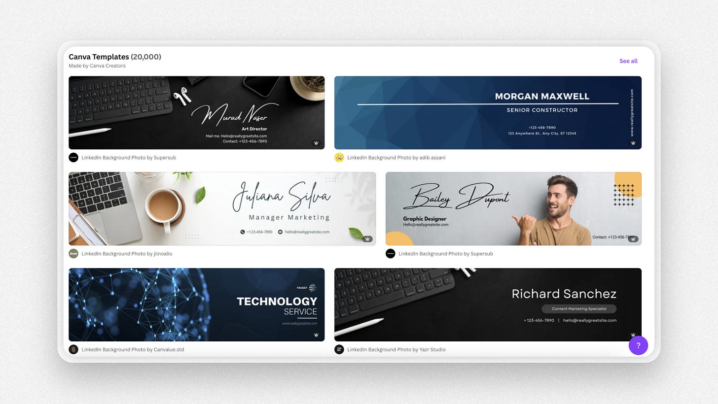 You can do it super easily in Canva—just search “LinkedIn banner” in its templates section, and a huge selection of pre-made templates with the perfect sizing will pop up.