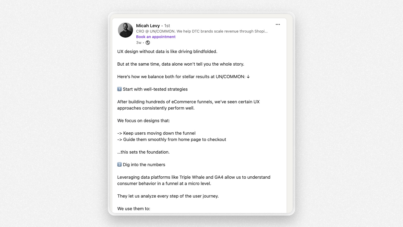 Just recently started my linkedin journey, and this has been very inspiring 🙏 while also helping me understand that there are high leverage initial moves that are difficult to undo, like what target audience to go after.