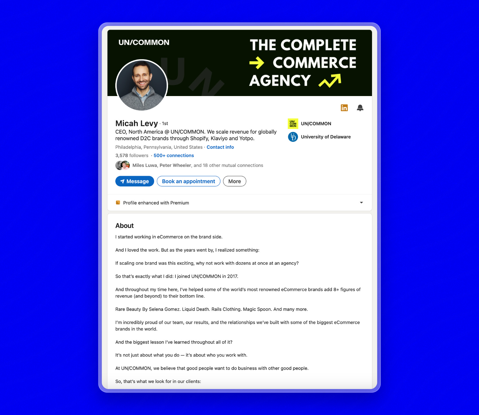 The result? Anyone reading his profile knows exactly what UN/COMMON does, who they serve, and what they stand for—in seconds.