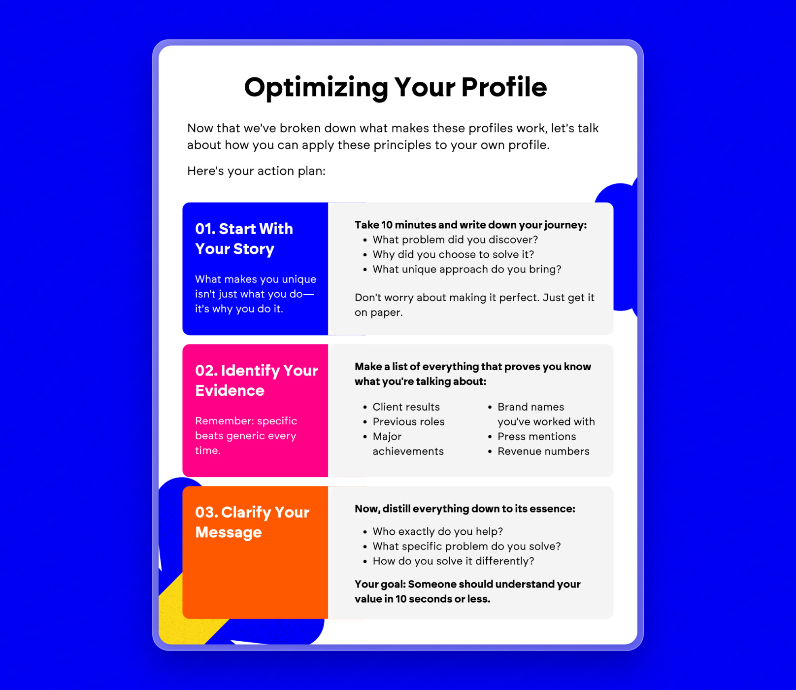 Now that we've broken down what makes these profiles work, let's talk about how you can apply these principles to your own profile.
