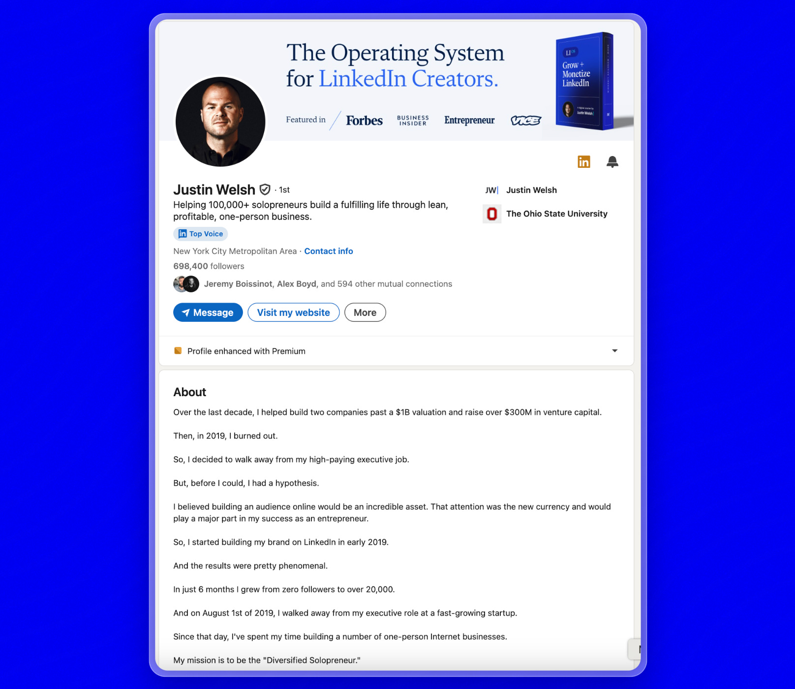 If you're Justin Welsh, you can talk about building billion-dollar companies. If you're just starting out, you talk about your dedication to client results and risk-free guarantees.